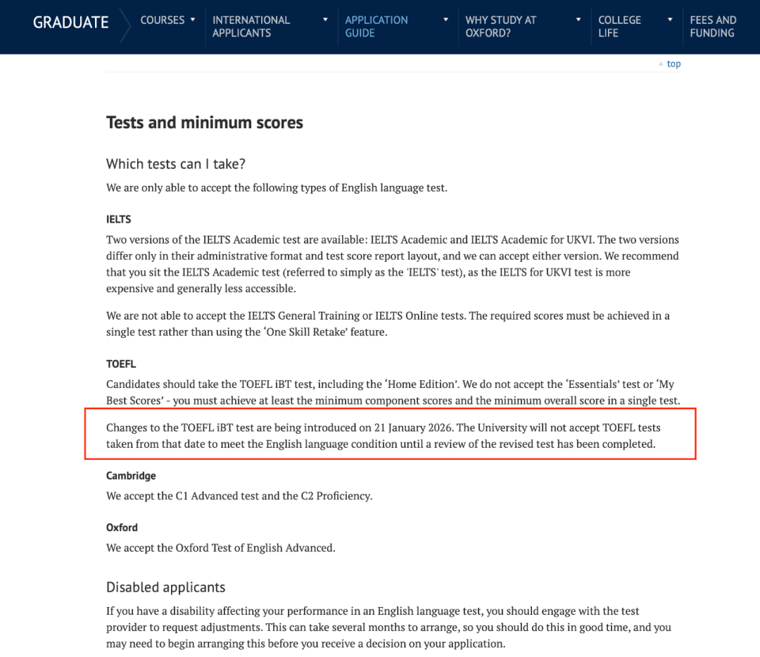 牛津大学研究生招生官网也更新公告:2026年1月之后的新托福版本,将不被接受,并提醒考生“请尽早选择其他被认可的语言考试”。